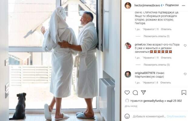 Как поклонницы ни пытались вывести его на чистую воду, 49-летний шеф-повар держит оборону. И вот совсем недавно решился на признание: у него есть возлюбленная, чье имя он хранит в секрете, передает Politeka.net. Правда, в своем микроблоге в Инстаграм Эктор выставил несколько снимков с ней, но так, чтобы не было видно лица. На последнем таком кадре судья "МастерШеф" позировал в халате, как в прочем и его пассия, отвернувшись к окну. Многие "узнали" в девушке коллегу Хименеса-Браво Ольгу Мартыновскую. Тут же все заговорили об их романе: "Узнаю Мартыновскую сзади)"; "Ох и Эктор! Шалун!!!"; "Так это ж Мартыновская! Не видите, что ли - халаты, тапки - всё отельное. А раньше были фотки, что они всей толпой отдыхают вместе"; "Ого, она выше вас ростом". Ольга отреагировала на домыслы, выставив в "сториз" скрин одной из новостей в СМИ, с интригующей подписью: "Эктор Хименес-Браво, нас рассекретили