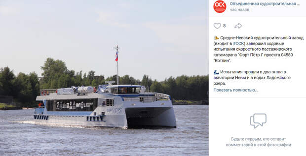 Ходовые испытания скоростного пассажирского катамарана «Форт Петр I» проекта 04580 «Котлин» завершены специалистами Средне-Невского судостроительного завода, сообщает пресс-служба Объединенной судостроительной корпорации 4 августа на официальном интернет-портале. Ходовые испытания проходили в два этапа: в акватории реки Невы и в водах Ладожского озера.