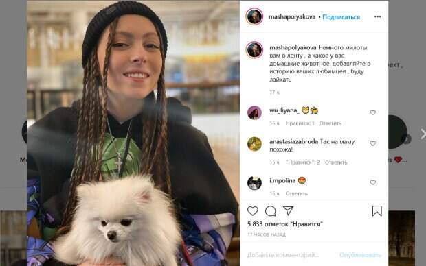 Для фото Маша выбрала наряд в уличном стиле. На ней черная толстовка и шапка. Необычной деталью образа школьницы стала ее новая прическа: Маша решила заплести свои длинные волосы во множество мелких косичек. На руках Полякова-младшая держит белоснежную собачку. «Немного милоты вам в ленту, а какое у вас домашнее животное? Добавляйте в историю ваших любимцев, буду лайкать», - написала девушка. Ее подписчики тут же отреагировали на новый пост. «Так на маму похожа!», «Зайка», «Очень красивая», «Красотки», «Ути-пути какой», «Нежная такая девушка, очень красивая!», - пишут люди. Ранее мы писали, что Маша рассказала о своих отношениях с матерью. По ее словам, жизнь ребенка знаменитости не такая уж и легкая. "Прежде всего это хейт. Я создала свою рок-группу и знакомые меня хейтят, но я человек, который не обращает на это внимание", - поделилась Маша. По словам Маши, наибольшие разногласия в отношениях с мамой возникают из-за гаджетов. "Телефон у меня забирают каждую ночь", - поделилась дочь украинской звезды. Напомним, юную дочь Поляковой вывели из себя нападки звездной мамы, девочка не стала молчать: "Меня очень...". Как сообщала Politeka, довольная Полякова похвасталась своими «богинями», красноречивый кадр: «Две, которые думают, что…». Также Politeka писала, что как выглядит мама-красотка Поляковой, фото пробирает до мурашек.