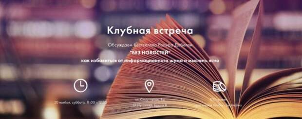 Дорогие друзья! Встречи Клуба друзей Klymenko Time выходят в оффлайн! В частности — в формате обсуждения книг! Наша первая такая клубная встреча состоится в субботу, 20 ноября, с 11:00 до 12:30 в киевском бизнес-центре «Гулливер». В этот раз обсуждаем бестселлер Рольфа Добелли «Без новостей: Как избавиться от информационного шума и мыслить ясно».