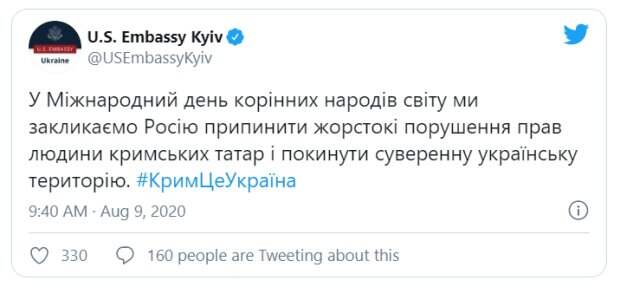 США обратились к российским властям в Международный день коренных народов мира: американские дипломаты также отметили жестокие нарушения прав крымских татар на полуострове, которые начались сразу после захвата Крыма. Также в сообщении отмечено, что Крым является суверенной украинской территорией, которую Россия должна освободить. «В Международный день коренных народов мира мы призываем Россию прекратить жестокие нарушения прав крымских татар и покинуть суверенную украинскую территорию», — заявили в дипломатическом представительстве, а свое сообщение они сопроводили хэштегом "КримЦеУкраїна". Также ранее сообщалось, что возможное нападение РФ с крымского направления было бы "слишком драматичным шагом для Кремля", поэтому этого не произойдет. Такое мнение высказал бывший спецпредставитель США по Украине Курт Волкер. Он также напомнил, что РФ ведет агрессию против Украины не только на поле боя, но и в тылу, используя гибридные методы. Напомним, Россия применила оружие в космосе: в США забили тревогу, что происходит. Также Politeka сообщала, США передадут Украине новую военную технику. Ранее Politeka писала, что генерал США в деталях раскрыл цели Кремля