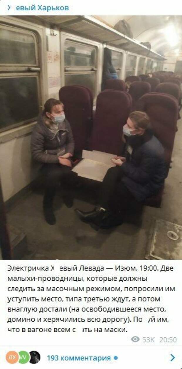 Жители Харькова пожаловались на работу проводниц в электричке Об этом пишет Телеграм-канал "Х.Х". По словам автора, проводницы вместо того, чтобы проверять масочный режим, попросили уступить им место, а после и вовсе достали домино и играли всю дорогу. "Электричка Харьков-Левада — Изюм, 19:00. Две малыхи-проводницы, которые должны следить за масочным режимом, попросили им уступить место, типа третью ждут, а потом внаглую достали (на освободившееся место, домино и играли всю дорогу).
