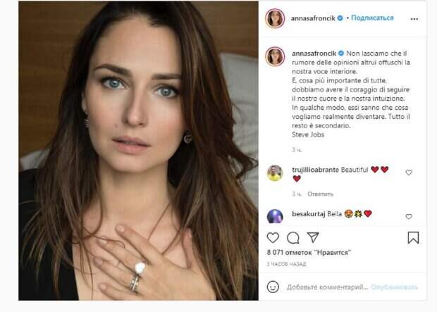 За внучкой Чапкиса следят сотни тысяч фанатов в Инстаграм и девушка старается их не расстраивать, радуя постоянно новым контентом. На новом фото Анна показалась в наряде с большим декольте, взявшись за него рукой. Красотка смотрела прямо в камеру, хвастаясь естественной красотой почти без мейкапа и завораживая глазами, в которых можно утонуть. "Давайте не позволим шуму чужих мнений затуманивать наш внутренний голос. И самое главное, мы должны иметь смелость следовать своему сердцу и интуиции. Каким-то образом они знают, кем мы действительно хотим стать. Все остальное вторично. Стив Джобс", - написала Анна под фото. Фанаты поставили более 8 тысяч лайков и написали комментарии: "Прекрасная", "Доброе утро, дорогая", "Прекрасная Анна. Очень красивая женщина. Живи жизнью белладонны", "Какая ты красивая", "Но никогда не стареешь, замечательно", "Без слов", "Я люблю твое лицо", "Но какая ты красивая", "Почему это личико такое грустное ...", "Совершенство. Спасибо", "От женщины к женщине ... ты обезоруживающей красоты!". Напомним, 40-летняя внучка Чапкиса из "Танців з зірками" в мини-бикини ошеломила формами, даст фору молодым А еще Politeka сообщала, что 40-летняя внучка Чапкиса из "Танців з зірками" изумила хрупкостью на фоне фантастического пейзажа Также Politeka писала, что внучка Чапкиса устроила горячие танцы в шелковом белье, дедушка может гордиться