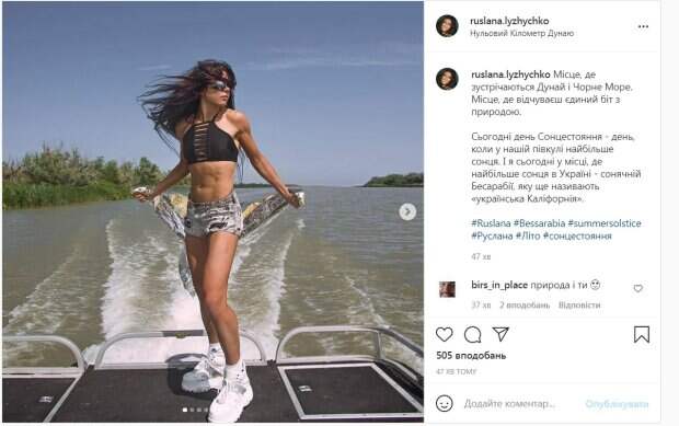 Сегодня день солнцестояния-день, когда в нашем полушарии больше всего солнца. И я сегодня в месте, где больше всего солнца в Украине - солнечной Бессарабии, которую еще называют «украинская Калифорния», - написала певица. Руслана позировала в мини шортах на черном топе на катере. Наряд позволил рассмотреть рельефную фигуру певицы. Ее физическая форма действительно впечатляет. Пользователи Сети не могли сдержать эмоций. "Терминатор Руслана", "Вы - круттющая", "Природа и ты", "суперская физическая форма", "Круто выглядите", - написали в комментариях. Отметим, секретом своей красоты Руслана называет мужчину. "Меня в жизни интересует лишь один мужчина, и он всегда рядом со мной. В этом и есть главный секрет моей красоты», - говорила артистка ранее. Отметим, с 1995 года Руслана замужем за продюсером Александром Ксенофонтовым. Напомним, Руслана показала, какой была во время свадьбы, редкое фото: "25 лет пролетели, как миг" Как сообщала Politeka, певица Руслана не оценила идею украинизации страны. Также Politeka писала, что Руслана назвала настоящих предков украинцев:"остаток СССР".