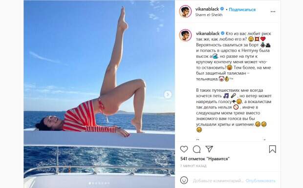 Певица призналась, что делать это на полном ходу было не только сложно, но и опасно. «Кто из вас любит риск так же, как люблю его я? Вероятность свалиться за борт и попасть в царство к Нептуну была высока, но разве на пути к крутому контенту меня может что-то остановить? Тем более, на мне был защитный талисман – тельняшка», - рассказала звезда. Она добавила, что в подобных путешествиях ей всегда хочется петь, однако она старается этого не делать из-за опасности для голоса. На снимках Смеюха позирует в ярко-красном купальнике-бикини и тельняшке с красными полосками. На одном из фото она полулежит на катере, высоко задрав вверх одну ногу. Звезда также поделилась видео, на которых показала, как проходило ее приключение. Поклонники знаменитости бурно отреагировали на ее пост. «Красота и грациозность», «Вау, вау! Море, солнце... Открытая и смелая Виктория просто ворвалась в эту жизнь побеждать! А жизнь любит смелых и настоящих!», «Конфетка», «Ну просто ОГОНЬ девушка», «Да я тоже люблю очень рисковать», - пишут люди. Напомним, Смеюха из "НеАнгелов" в прозрачной накидке и без белья устроила испытания страстью: "Обожаю смотреть...". Как сообщала Politeka, Влад Яма устроил жаркие танцы с красоткой-брюнеткой в ресторане, Вика из «НеАнгелов» все засняла. Также Politeka писала, что Смеюха из "НеАнгелов" в ярких трусиках зажгла у бассейна: "Украина скинула на Египет соблазнительную бомбу".