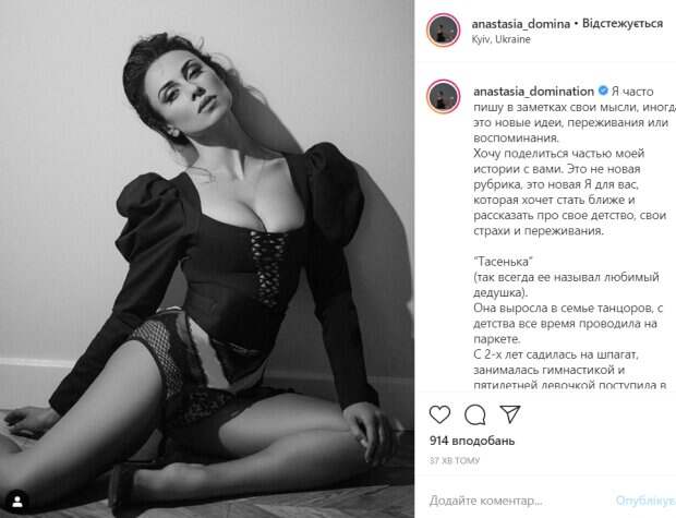 Красотка смотрела в кадр, а ее прелести так и норовили выпрыгнуть из наряда. «Я часто пишу в заметках свои мысли, иногда это новые идеи, переживания или воспоминания. Хочу поделиться частью моей истории с вами. Это не новая рубрика, это новая Я для вас, которая хочет стать ближе и рассказать про свое детство, свои страхи и переживания», - подписала фото Кумейко, после чего опубликовала рассказ из своего детства под названием «Тасенька». Кумейко рассказала, что выросла в семье танцоров, поэтому с детства танцевала и занималась гимнастикой. По словам певицы, она не подходила под стандарты танцевальной худобы, хоть и была способной ученицей. За час пост собрал более тысячи лайков. В комментариях ей оставили массу комплиментов. «Муська моя», «Путь чемпиона», «Такая красивая», «Класс», - пишут пользователи сети. Напомним, что Анастасия Кумейко в нижнем белье показала свой неидеальный животик: "Напоминание о том, что...". Как сообщала Politeka, Анастасия Кумейко похвасталась умениями в костюме с пикантной изюминкой: "Баланс дело тонкое". Также Politeka писала, что Анастасия Кумейко бесстыдно натянула экстра-мини и показала пикантную деталь: "Никогда не угадаете...".
