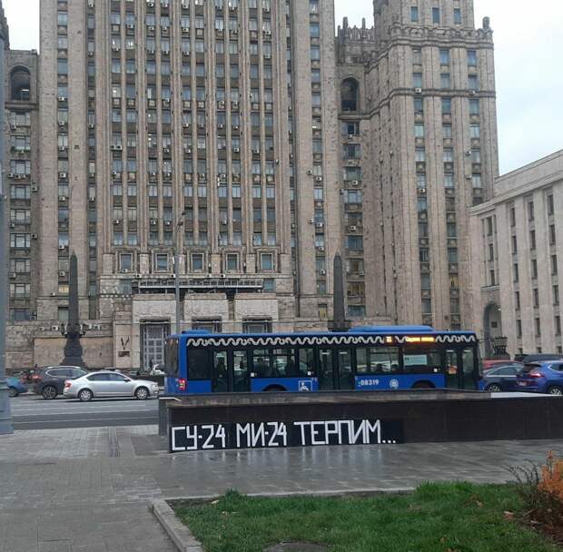 Сегодня с утра напротив здания МИД России в Москве появилось граффити, посвященное отсутствию жесткой реакции на вчерашнее уничтожение «Азербайджаном по ошибке» российского боевого вертолета в Армении. «Су-24, Ми-24 терпим», – такая надпись нанесена на парапете через дорогу от центрального входа в министерство.