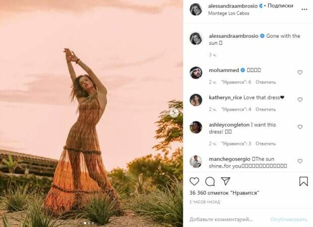 Образ завершили стильные украшения. Тонкий поясок на талии подчеркнул ее, а из-за прозрачной ткани стали видны стройные длинные ножки. Модель растянулась на фоне заката. Она приподняла руки и закрыла глаза. Ветер игрался с ее волосами, сама красотка выглядела очень непринужденно. За три часа пост собрал более 30 тысяч лайков и много комментариев. Пользователи сети написали ей много приятного, ведь фигура красотки достойна только таких слов. "Прекрасная Алессандра", - написал один из поклонников. Ранее мы писали, что Алессандра Амбросио покорила формами на пляже, нарядившись в крохотное бикини. Знаменитость надела маленький купальник розового цвета, который подчеркивал и оголял самые пикантные места. Знаменитость также взбудоражила эффектным ракурсом, встав перед фотографом полубоком. Ранее сообщалось, что Алессандра с влажными волосами, в соломенной шляпке и накинутом на плечи оранжевом парео сидела во дворе со щенком лабрадора. Девушка прижала к груди малыша, блеснув пикантными линиями и округлостями, стянутыми темно-зеленой маечкой. Звезда подвинула камеру, дабы показать морду щенка крупным планом, но при этом, очевидно, что поклонники любовались не только животным. Напомним, что модель Алессандра Амбросио в пикантном купальнике подразнила аппетитными изгибами: "Русалка!". Как сообщала Politeka, Алессандра Амбросио в крохотном бикини соблазнила упругим телом: от вида захватывает дух. Также Politeka писала, что Алессандра Амбросио подразнила сочными изгибами, задрав руки в микроскопическом купальнике: «Ярче солнца!».
