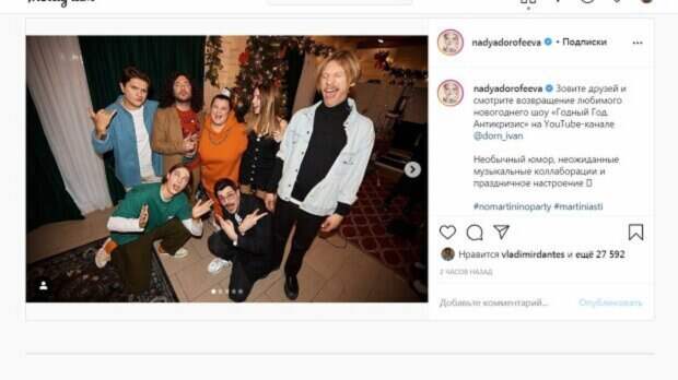 Также в кадре заметна надпись, рассказывающая о том, без чего нет настоящей вечеринки. «Тебя завтра такое ждет от фан-клуба», «хорошего отдыха тебе, Надюша!», «красотка», «Надя, с Наступающим тебя Новым годом!», «лучшая в мире певица Украины. Наконец-то красивая девушка!», - пишут ее поклонники. До этого мы рассказывали, что певица и экс-участница "Время и стекло" Надя Дорофеева похвасталась фигурой в компании других звезд Дорофеева блистала в двух облегающих платьях, схожих по крою, но разных цветов. Наряды оголяли стройные ножки и плечи звезды. На общем снимке певица была в компании Ивана Дорна, своего коллеги Алексея Завгороднего (Позитив), хип-хоп-исполнительницы Alyona Alyona и других известных личностей. На другом снимке красотка была вместе со своим мужем, певцом Владимиром Дантесом. Напомним, Дорофеева в "сеточке" дерзко расставила ноги, обратившись к публике, Никитюк поддержала А еще Politeka сообщала, что красотка-двойник Дорофеевой взбудоражила фантазии сочным лакомством, Потап будет в восторге Также Politeka писала, что Могилевская и Дорофеева устроили "жару" в соблазнительных нарядах