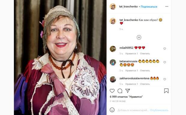 Новый образ, в котором сфотографировалась Кравченко, выглядит как раз для театра. Так, актриса предстала в ярком красно-синем платье с асимметричным кружевным воротом и другими украшениями. На голове у звезды красуется своеобразный чепчик, украшенный цветами. Дополняет образ макияж с ярко-красной помадой. В целом наряд актрисы выглядит немного неряшливо и даже слегка безумно. Поклонники бурно обсуждают фото в комментариях. «Ой, класс! Прям "черти что и сбоку бантик"», «Во всех ты, душечка нарядах хороша!», «Нарядный образ», «Мадам Брошкина!», «Татьяна, Вы, супер! Позитив, доброта, красота!», «Умереть и не встать», «Царь-баба, красавица, талантище, обожаю!», «Вам все идет», «Вы в любом образе огонь», «Красопеточка, мы вас в любом образе любим и уважаем!», - пишут люди. Напомним, веселая Валюха из "Сватов" в домашнем платьице показала, чем покоряет сердца: "Это ж надо, столько..." Как сообщала Politeka, нарядную Валюху из "Сватов" засекли в магазине, актриса покорила образом: «Какая Красоточка» Также Politeka писала, что постаревшая Валюха из «Сватов» напугала запущенным видом, актрису не узнать: «Надеюсь, это вы в роли».