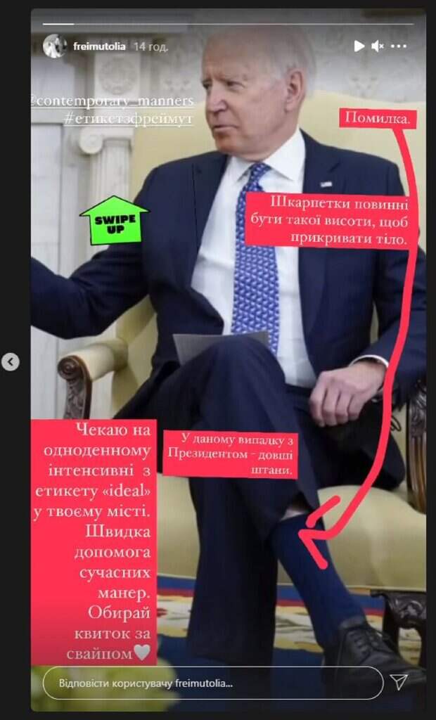 На новом фото, которое Оля опубликовала в Инстаграм, Фреймут показала кадр, на котором был Джо Байден, президент США. Девушка решила рассказать, что с политиком не так. "Ошибка", - написала Оля, показывая стрелкой на верхнюю часть носка Байдена. "Носки должны быть такой высоты, чтобы прикрывать тело", - рассказывает Фреймут. "В данном случаи с президентом - длинные штаны", - продолжила Оля. "Жду на однодневном интенсиве по этикету "Идеал" в твоем городе. Быстрая помощь современных манер", - предложила встретится украинцам Оля. Напомним, Фреймут прямо в уборной решила преподать украинцам урок этикета А еще Politeka писала, что Фреймут предупредила украинцев о "монстрах" в шоу-бизнесе Также Politeka сообщала, что Фреймут впервые призналась, сколько тысяч долларов зарабатывает на свадьбах
