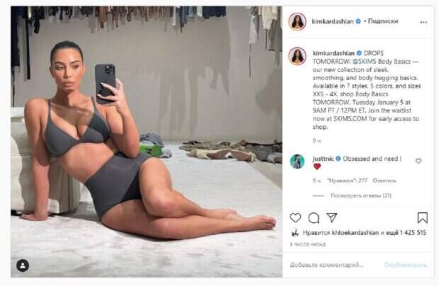 Известная модель Ким Кардашьян показала себя в новом смелом образе На фото красотка позировала в обтягивающем белье. Ким еле вместила пышный бюст в лиф, который прижимал максимально фамильную драгоценность. Волосы у девушки были собраны в хвост, а сама девушка расположилась на полу в гардеробной. Модель снимала себя на телефон, позируя перед зеркалом.