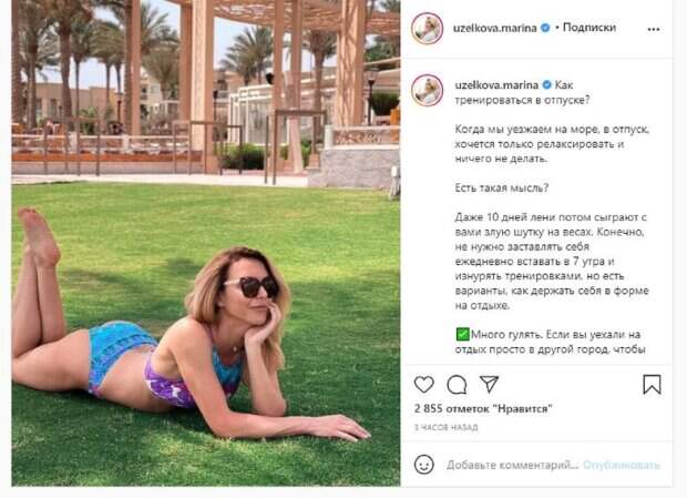 Сейчас девушка уехала с детьми на курорт и решила рассказать, как на отдыхе сохранить форму: "Как тренироваться в отпуске? Когда мы уезжаем на море, в отпуск, хочется только релаксировать и ничего не делать. Есть такая мысль? Даже 10 дней лени потом сыграют с вами злую шутку на весах. Конечно, не нужно заставлять себя ежедневно вставать в 7 утра и изнурять тренировками, но есть варианты, как держать себя в форме на отдыхе", - написала Марина под фото. Фанаты поставили почти 3 тысячи лайков и написали комментарии: "Марина, вы очень классная", "Обожаю много ходить по экскурсиям и люблю плавать", "Иногда тренируюсь в удовольствие, но в основном - это прогулки и плавание", "Как всегда, очень красивая", "Много гуляем (постоянное движение) и конечно плавание, загар". Напомним, экс-жена Узелкова в купальнике с сеточкой рассказала, как сделать утро аппетитным А еще Politeka сообщала, что экс-жена Узелкова в бикини получила порцию витамина D и советов от украинцев Также Politeka писала, что экс-жена Узелкова показала подросших сына и дочь от боксера, Маша Ефросинина не смогла пройти мимо