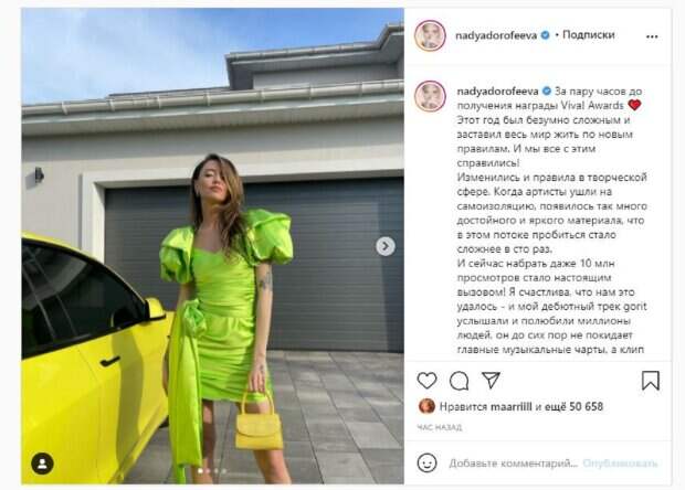 На фото Надя показалась в коротком салатовом платье, позируя у нового автомобиля Владимира - Tesla и большого особняка. На еще одном кадре звезда уже держала свою награду, подняв ее вверх. А в конце "карусели" девушка опубликовала видео, где видно, как она вышла на сцену. "За пару часов до получения награды Viva! Awards. Этот год был безумно сложным и заставил весь мир жить по новым правилам. И мы все с этим справились! Изменились и правила в творческой сфере. Когда артисты ушли на самоизоляцию, появилось так много достойного и яркого материала, что в этом потоке пробиться стало сложнее в сто раз. И сейчас набрать даже 10 млн просмотров стало настоящим вызовом! Я счастлива, что нам это удалось - и мой дебютный трек gorit услышали и полюбили миллионы людей, он до сих пор не покидает главные музыкальные чарты, а клип набрал уже 50 млн просмотров", - написала звезда под кадрами. Фанаты поставили более 30 тысяч лайков и написали комментарии: "Ты достойна этого! Любим сильно", "Надя! Любимая наша! Ты это заслужила, я смотрю на тебя и понимаю что ты безумно крутая! Ты крутая не только в плане творчества, но и в человеческих качествах...", "Вова специально купил машину тебе под сумочку)))", "Поздравляю с приобретением! ", "Машина прямо подходит". Напомним, Дорофееву, оставшуюся без Дантеса, подловили в объятиях дизайнера Лободы и Тины Кароль А еще Politeka писала, что муж Дорофеевой Дантес с упреком обратился к украинцам Также Politeka сообщала, что Дорофеева в маленьком бикини пожаловалась на свой неожиданный комплекс