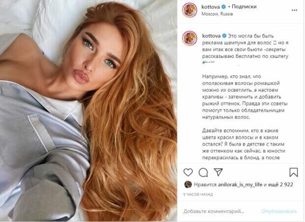 На снимке модель предстала в атласной пижаме серого цвета. Блондинка игриво приспустила рубашку, сверкнув "шелковой" кожей. Артистка сделала губы "уточкой" и посмотрела в камеру. Ее макияж был неброским - с активными стрелками на веках и помадой нюдового оттенка. Также нельзя не обратить внимание на длинные волосы, которые она уложила легкой волной на подушке. В посте Котова поделилась секретами красоты "Ополаскивая волосы ромашкой можно их осветлить, а настоем крапивы - затемнить и добавить рыжий оттенок. Правда эти советы помогут только обладательницам натуральных волос", - рассказала Татьяна. Также звезда поинтересовалась у поклонников, кто в какие цвета красился. "Я была в детстве с таким же оттенком, как сейчас, в юности перекрасилась в блонд, а после выхода из группы «ВиаГра» захотелось перемен, отсюда вернулось золото в мои волосы...", - написала артистка. За пять часов пост собрал почти 3000 лайков и много комментариев: "Ничего себе, если честно, впервые вообще слышу про ромашку и настой крапивы😁 очень круто на самом деле👍", "Волосы просто приводят меня в восторг. Они нереально шикарные. Я уверена многие девушки вам завидуют. ☺❤👐", "невероятная😍😍😍 этот цвет мне нравится больше! тебе бы реально в рекламу шампуня с такой потрясной гривой🙈❤️". Напомним, жаркая блондинка из "ВИА Гры" без белья показала, что прячет под пиджаком А еще Politeka писала, что роскошная блондинка из "ВИА Гры" Котова показала сочный ракурс без нижнего белья Также Politeka сообщала, что блондинка из "ВИА Гры" избавилась от трусиков, прикрыв срамоту арбузом