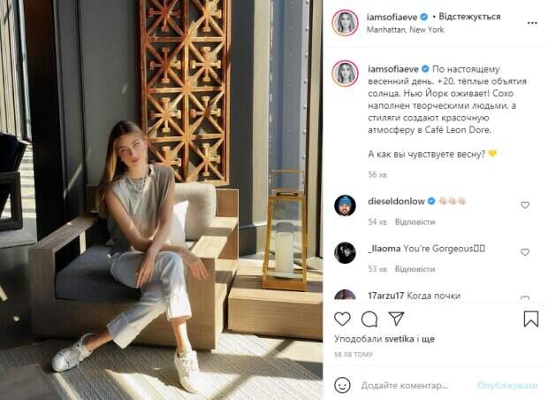 Так, в этот раз Соня показала очаровательный кадр с прогулки мегаполисом, а в подписи к нему поделилась, что в Нью-Йорке уже настоящая весна. На новом фото красотка запечатлена в уютном кафе, сквозь окна которого пробиваются солнечные лучи, так что снимок полностью передает атмосферу и настроение весны. На прогулку Евдокименко вышла в стильно образе – на ней белые укороченные брюки и светлая футболка, а на ногах белоснежные кроссы. Волосы красотки распущены и аккуратно уложены, а на ее лице легкий макияж, она томно смотрит в объектив. В подписи к кадру Соня написала: "По-настоящему весенний день. +20, теплые объятия солнца, Нью-Йорк оживает! Сохо наполнен творческими людьми, а стиляги создают красочную атмосферу в Café Leon Dore. А как вы чувствуете весну?". Поклонники тут же принялись обсуждать очаровательное фото девушки, восхищаясь ее красотой и засыпая комплиментами в комментариях к публикации. Напомним, что внучка Ротару произвела фурор роскошной внешностью и раскрыла свой секрет: «Какая же красотка» Как сообщала Politeka, 19-летняя внучка Ротару в крохотном топе провела сеанс соблазнения: "Просыпайтесь...". Также Politeka писала, что 19-летняя внучка Софии Ротару показала, как наслаждается жизнью с женихом-миллионером: фото счастливой парочки.