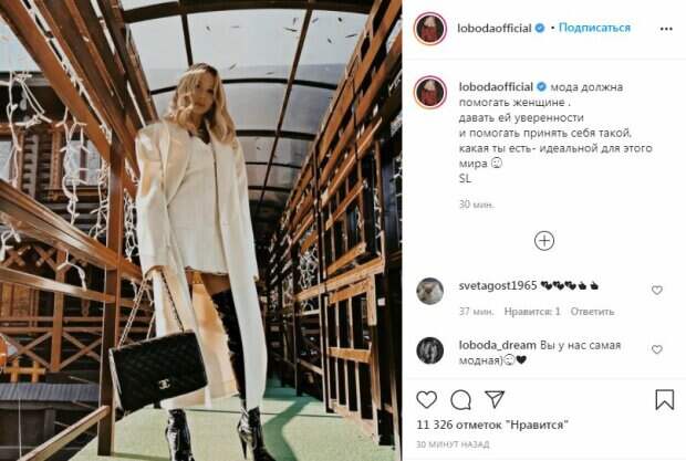 Нежности образу добавлял эффектный макияж и завитые "кудряшки". "Мода должна помогать женщине, давать ей уверенности и помогать принять себя такой, какая ты есть- идеальной для этого мира. SL", - говорится в подписи к снимку. Пользователям понравилась публикация и они завалили ее "лайками" и восторженными комментариями. "Такая красотка. Украшение для моды", "Вы самое идеальное событие, что происходило когда либо на земле", "Вы очень красивая, Светлана!", "Красотка", "Волшебная", "Лободуся, вы супер модница", "Замечательная фотография! Великолепная Светлана Лобода!", "Какие сапожки Светлана Сергеевна", "Богиня", "Прикид не хилый", "Идеальная всегда и везде", "Королева", "Вы у нас самая модная", - написали фанаты в комментариях под фотографием. Ранее мы рассказывали, как Светлана Лобода в откровенном купальнике порадовала фанатов. Так, на последнем снимке, который появился в ее микроблоге Лобода попозировала в модном купальнике в черную-белую полоску. На плечи певица набросила шаль в тон, а волосы ее были распущены и небрежно развевались на ветру. Темные очки дополнили пляжный образ. Напомним, что сочная Лобода в пикантном комбинезоне заставила говорить о себе Как сообщала Politeka, Лобода вся в белом показала своих подросших красавиц-дочерей Также Politeka писала, что фигуристая Лобода обнажила хищную натуру, мужчины пускают слюни