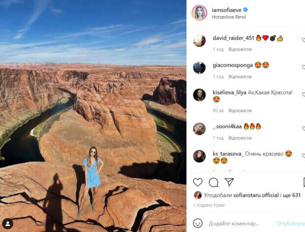Недавно Соня отпраздновала свое 20-летие. Вместе со своим женихом, предпринимателем Денисом Жадановым она отправилась в путешествие по красивым местам Америки, где сейчас проживает. На свежем фото девушка позировала возле невероятно красивого каньона. Для прогулки Евдокименко выбрала легкое летнее платье и сапоги. «Всегда выбирайте живописный маршрут», - подписала фото Евдокименко. В комментариях ей оставили массу приятных отзывов. «Бесстрашная красотка», «Ах, Какая Красота!», «Восторг», «Очень красиво», «Какая милая», «Отличный вид», - пишут пользователи сети. Ранее мы писали, что Соня Евдокименко похвасталась прогулкой в японском саду посреди США. На фото девушка была запечатлена среди высоких густых деревьев, в которых утопало удивительное здание в японском стиле. На прогулку молодая модель вышла в стильном голубом костюме и модных белых кроссовках. Этот наряд подчеркнул идеальную фигуру Софии. Напомним, что внучка Ротару впечатлила весенним образом в желтом платье: "Прекрасная принцесса". Как сообщала Politeka, внучка Ротару живет с женихом-миллионером в палатке и жарит еду на костре: личные кадры. Также Politeka писала, что 20-летняя внучка Ротару блеснула загорелыми ножками перед женихом-миллионером: "Класс! ".