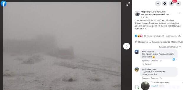 Посреди осени в Украине выпал первый снег, который принес с собой заметное похолодание Как стало известно Politeka.net, 14 октября снежные осадки накрыли Карпаты на границе Ивано-Франковской и Закарпатской области. Пресс-служба Черногорского горного поисково-спасательного поста опубликовала фото на странице в соцсети Facebook.
