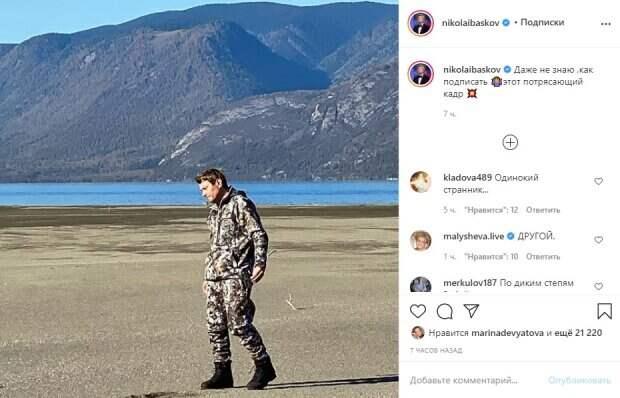 Известный российский исполнитель Николай Басков решил побродить по пустынному берегу водоема Как сообщает Politeka, певец показал на своей странице в Instagram новый снимок со своего отдыха. Так, на фото Басков идет по берегу водоема, сзади которого виднеются горы. Берег поражает своей пустынностью, а сам Николай одет в камуфляжную форму и высокие армейские ботинки.