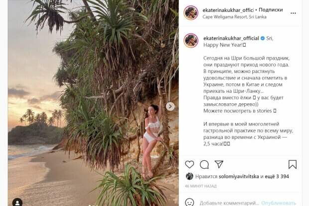 На одном из кадров у артистки спала бретелька лифчика с плеча, что придало образу особой пикантности.  На другом фото звезда позировала на берегу, когда волна намочила ножки и ягодицы. Вышло завораживающе прекрасным, и видно, что Екатерина отдалась волне, получая наслаждение и заставив всех себе завидовать.   "Sri, Happy New Year!