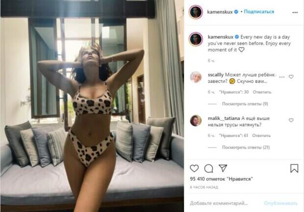Во время каждого отпуска Настя демонстрирует фигуру в бикини с высокой посадкой, крутит ягодицами на камеру и без смущения раздевается, снимая даже белье. Это становится причиной недовольства в сети. Этот раз не стал исключением. Так, Каменскхи с Потапом улетела на Мальдивы, откуда и поделилась новым фото. На нем звезда предстала одном из своих любимых пудровых бикини с принтом леопарда. Позируя в провокативной позе, Каменских подчеркнула талию и вызвала споры в сети. 33-летней звезде советуют завести ребенка и сменить стиль, чтобы не задирать бикини так высоко: «Может лучше ребёнка завести?