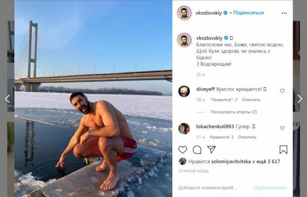 Известный певец Виталий Козловский записал видео того, как он окунается в прорубь. Певец был лишь в одних плавках. Не смогла остановить артиста морозная погода - на градуснике показывало "-12". Певец Виктор Павлик, в честь праздника, обнаженным прыгнул в прорубь. Артист окунулся в ледяную воду в загородном отеле. А видео его отчаянного поступка снимала беременная жена, Екатерина Репяхова. Ресторатор и судья кулинарного шоу "МастерШеф" Эктор Хименес-Браво поздравил украинцев с теплых краев. Шеф-повар окунулся в бассейн и поприветствовал украинцев. "С Крещением, мои дорогие!