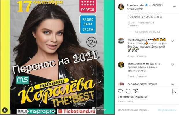 Российская звезда Наташа Королева озадачила необычным постом Как сообщает Politeka со ссылкой на Инстаграм знаменитости, певица сообщила о переносе своего концерта, намеченного на 17 октября. Причем, перенос, связанный с пандемией китайского вируса, довольно-таки значительный по времени. Королева анонсировала проведение своего концерта аж 17 апреля следующего года.