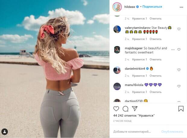 Также девушка нередко устраивает фотосессии на берегу у океана, поэтому ее профиль в социальной сети выполнен в светлом стиле. В этот раз Осланд показала хороший вид сзади, позируя в серых лосинах и нежно-розовом топике со спущенными бретельками. Для большей пикантности Хильде отвернулась к камере спиной. Вот что пишут в сети: «Выглядит очень красиво. Симпатичный наряд тоже; Идеально каждый раз, дорогая