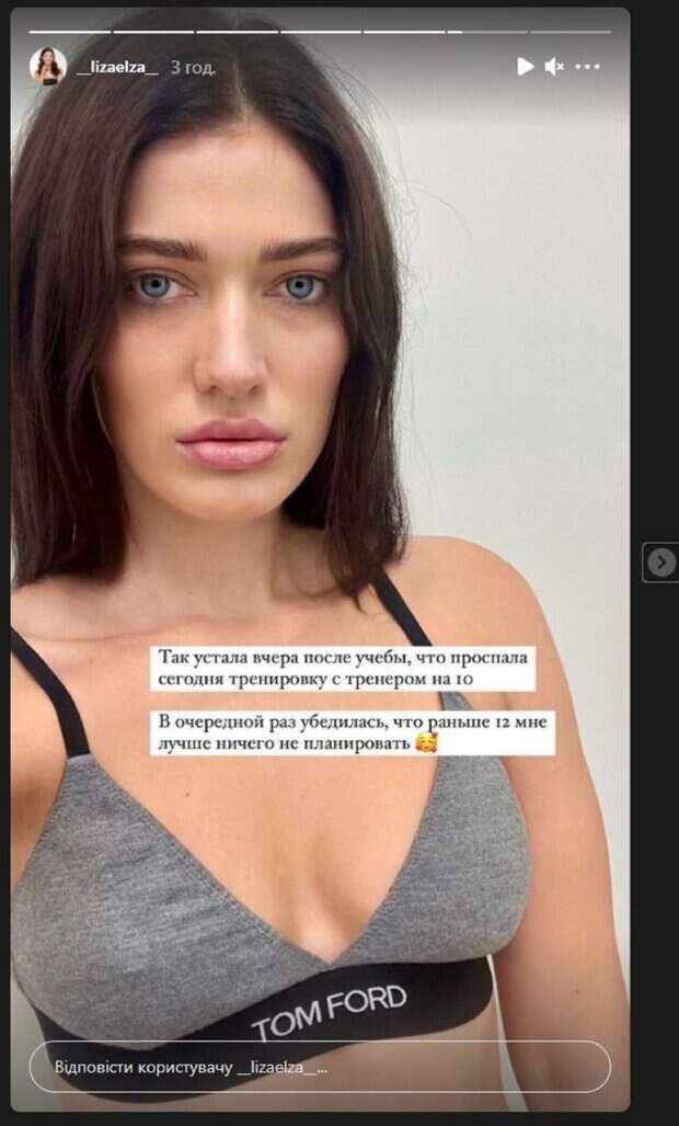 Не забывает Ястремская и об Инстаграм, где делится с фанатами всем интересным. В этот раз Елизавета показалась в спортивном топике, а волосы оставила распущенными. Красотка сделала селфи, показав свою фигурку на крупном плане. "Так устала вчера после учебы, что проспала сегодня тренировку с тренером на 10", - рассказала об утренней проблеме Ястремская. "В очередной раз убеждаюсь, что раньше 12 мне лучше ничего не планировать", - подытожила Елизавета. Фанаты не смогли написать девушке комплименты, так как снимок был в сторис Инстаграм. Напомним, "Мисс Украина 2020" Ястремская в черном платье с сеточкой показала подтянутые формы А еще Politeka рассказывала, что "Мисс Украина 2020" Ястремская показала, как достигает идеала в спортзале Также Politeka сообщала, что "Мисс Украина" Ястремская в бикини с банными принадлезностями показала свой способ повышения иммунитета