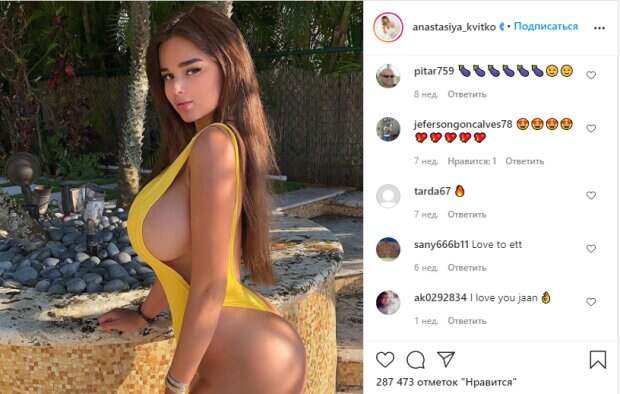 Примечательно, что при весе 70 килограмм при низком росте девушке удается выглядеть заметно стройнее, чем обычно. Квитко позировала к объективу боком, чтобы показать тем самым не только выскользнувшую грудь из-под тонкой ткани купальника, но еще и посветить неестественно пышными бедрами. Анастасия удачно выгнулась рядом с камерой и произвела бурный эффект на поклонников. «Хорошая погода напомнила мне эту фотографию. Хороших дней☀️», - пишет Настя под постом. Вот что отвечают фанаты: «Как бы скрывала лишнее, но совсем не скрыла лучшее