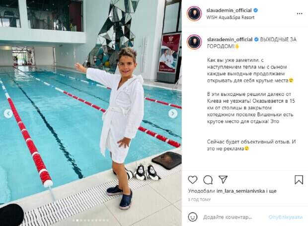 На новых снимках Слава показал коттеджи, красивую территорию и бассейн загородного комплекса, а в подписи к публикации рассказал о шикарном отдыхе. На снимках ведущего можно увидеть и его подросшего сына Влада, с которым и отправился на отдых. На снимках парня можно увидеть в белом халате у бассейна и в самом бассейне во время плавания. Также селфи в халате сделал сам ведущий. В подпсии к публикации Демин рассказал об этом загородном комплексе, и даже назвал цену проживания – три тысячи гривен на двоих за сутки. "Как вы уже заметили, с наступлением тепла мы с сыном каждые выходные продолжаем открывать для себя крутые места. В эти выходные решили далеко от Киева не уезжать! Оказывается, в 15 км от столицы в закрытом коттеджном поселке Вишеньки есть крутое место для отдыха!", - поделился Слава и рассказал о возможностях, которые предоставляет этот загородный комплекс. Напомним, Ведущий "Голосу країни" засветил усики Каменских, такой жену Потапа еще не видели: "Роскошная!" Как сообщала Politeka, Ведущий "Голосу країни" бегал по центру Киева в розовых колготах: "Кончита Вурст уже не та". Также Politeka писала, Ведущий "Голосу країни" показал результат резкого похудения на новом фото: "Никогда бы не подумал. ..".