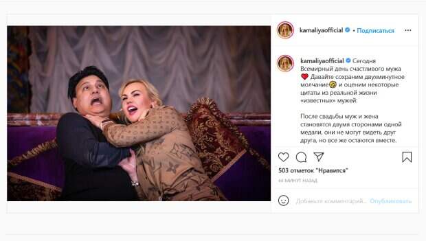 По этому поводу она собрала подборку забавных цитат о замужестве. «Давайте сохраним двухминутное молчание и оценим некоторые цитаты из реальной жизни «известных» мужей: Жена вдохновляет на великие дела и мешает их достичь. - Майк Тайсон «Брак - единственная битва в мире, где противники делят постель». - Эндрю Кутто Поздравления с Всемирным днем мужа», - написала певица. Такой пост она не могла не проиллюстрировать совместным снимком со своим супругом, миллиардером Мохаммадом Захуром. Впрочем, фото оказалось весьма оригинальным. На нем Камалия и ее муж сидят на диване, причем певица одной рукой душит возлюбленного. При этом, звезда довольно смеется, а Захур изо всех сил изображает на своем лице ужас. Поклонники Камалии бурно отреагировали на ее пост. «Фото конечно – зачетное», «Какой класс, бомбезное фото и красивая пара», «У Вас очень красивый Look Louis Vuitton», «Аааа, какие Вы класснючие!) Обожаю вас!», «Шикарная фотка! Счастья вам!», «Юмор мужа дорогого стоит - это помогает в любой ситуации!», - пишут люди. Напомним, муж самой богатой певицы Украины расцвел в компании именинницы-Билык: «У Ирочки совсем…». Как сообщала Politeka, самая богатая певица Украины пожаловалась на мужа-миллиардера, который сбежал и обманул: "Более того, Захур. ..". Также Politeka писала, что самая богатая певица Украины засветила свой золотой дворец и близняшек-наездниц: «В райском саду…».