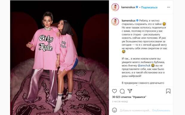 net. Каменских раскрыла, что в клипе снялась ее подруга, жена певца Позитива, Анна Андрийчук-Завгородняя. «В моем новом клипе вы увидите моего любимого бублика, мою Анечку. Вы не представляете себе, как нам было весело, а в такой обстановке все в разы кайфовей. В предверии главного девчачьего праздника, 5 марта выходит моя новая песня «Девочки рулят»!», - сообщила Каменских. При этом, сам клип выйдет чуть позже. Настя также поделилась снимком с Завгородней, судя по всему, сделанным на съемках клипа. На нем обе красотки позируют в свободных розовых кофтах со стильным принтом. При этом, Анна надела широкие розовые штаны, а Настя – короткие шортики, обнажающие ее стройные ножки. На новость отреагировала Даша Астафьева. «Аню теперь не остановить…женщина сверху», - написала она. Потап, Соня Плакидюк Надя Дорофеева оставили под снимком смайлики. Поклонники Каменских также прокомментировали фото. «Настя беременна», «Уиииии! Какие вы кайфовые!», «Настя подстриглась или Аня беременна», «Привет карамельки», - пишут люди. Напомним, категоричный Данилко отшил приставучую Каменских на шоу "Маска", кадры отказа: "Не мой...". Как сообщала Politeka, Каменских, Гросу и подруга Макса Барских раззадорили формами в бесстыжих декольте, у кого больше: "Чумачечая весна". Также Politeka писала, что трагедия подкосила Каменских, Потап делает все, что может: "Мы даже не думаем, что он...".
