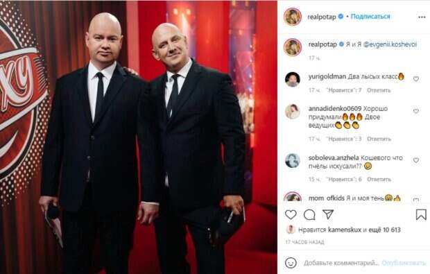 koshevoi", - с сарказмом подписал снимок автор поста. Оба лысые и в стильных черных костюмах, шоумены поразили не только внешним сходством. Внимательные пользователи обратили внимание на вид Кошевого. Лицо юмориста заметно раздалось вширь, что видно невооруженным глазом. Комментирующие в шутливой манере обсудили красавчиков: "Два лысых класс