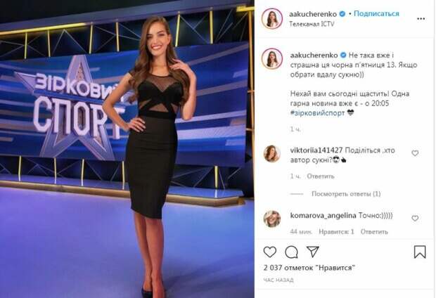 Модель и жена телеведущего Дмитрия Комарова Александра Кучеренко знает, как покорять сердца фанатов Новая публикация появилась в ее личном Instagram. Так, обладательница титула "Мисс-Украина" засветилась на телевидении в откровенном платье, которым свела с ума армию своих поклонников. Как известно, жена ведущего Дмитрия Комарова ведет телепередачу "Зірковий спорт" на украинском телеканале, и по случаю "пятницы 13" решила подобрать сногсшибательное "прозрачное" платье.