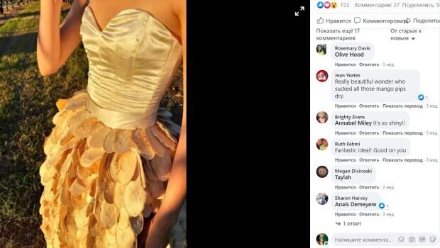 Девушка по имени Джессика Коллинз из Австралии пошила необычное платье Ей нужно было сделать наряд в качестве проектной работы на курсе дизайна и технологии, и к этой задаче она подошла весьма креативно. Так, она пошила платье из 1400 манго, использовав только высушенные косточки плодов. Готовый вес изделия составил около 5 килограммов.
