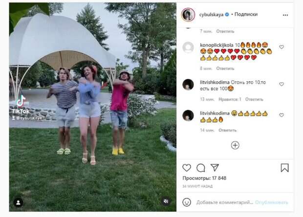 Красотка пустилась в пляс вместе с двумя парнями. Видео получилось забавным и зажигательным, и Оля решила попросить оценить видеоролик фанатам: "Оцени наш танец от 1 до 10 кто-то: Оля, до конца лета осталось 2 недели. Что будем делать? я:". Фанаты посмотрели ролик почти 20 тысяч раз и написали комментарии: "Вы крутая", "Кормлю сына и подтанцовываю", "Зажигалочка, супер, 10", "Вау", "От что-что, а а парни прикольные", "Госпожа Цибульская прямо огонь", "Огонь, это 10, то есть все 100". Напомним, кума Дзидзьо Цибульская без макияжа и с растрепанными волосами вызвала ажиотаж А еще Politeka писала, что кума DZIDZIO Цибульская рассказала о трудностях поддержания идеальной фигуры Также Politeka сообщала, что кума DZIDZIO Цибульская выдала свое условие участия в шоу "Танці з зірками"