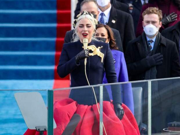 Известная американская певица Леди Гага на днях поучаствовала в церемонии инаугурации 46-го президента США Джо Байдена. Артистке выпала честь исполнить перед согражданами гимн страны. Для своего выхода Леди Гага выбрала эффектный наряд – пышную красную юбку и темно-синий пиджак. Образ дополнен изображением золотого голубя на груди, кожаными перчатками и оригинальной прической.
