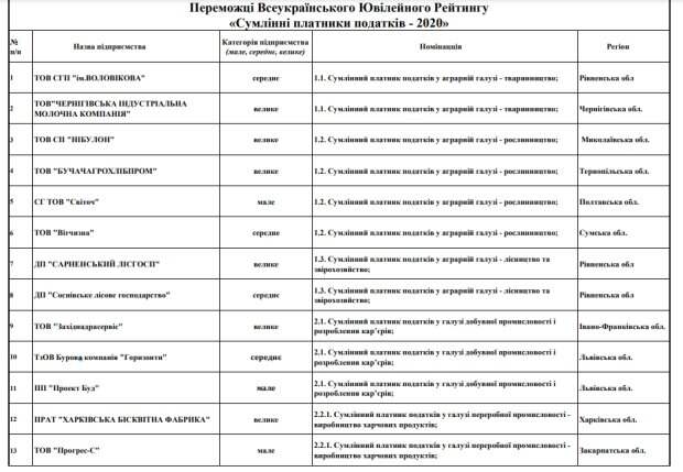 Визначено переможців Всеукраїнського Ювілейного Рейтингу «Сумлінні платники податків - 2020»