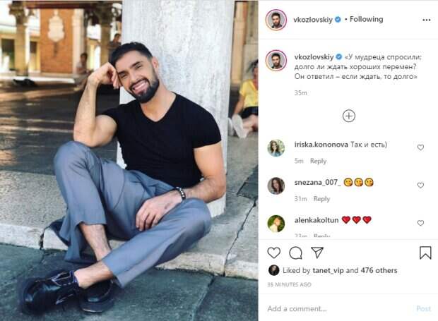 Виталий Козловский с радостной улыбкой уселся под колоной посреди улицы, снял пиджак и положил его себе на бедро. Он облокотился на на собственное колено и продемонстрировал внушительные бицепцы на руках. Можно заметить, что на заднем плане отдыхали другие люди, которых артист, похоже, нисколько не стеснялся. Пикантности фото придали штаны, которые слегка задрались и обнажили лодыжки. «У мудреца спросили: долго ли ждать хороших перемен? Он ответил – если ждать, то долго», - поделился мудростью Виталий в описании к снимку. Пользователи социальной сети оценили внешний вид исполнителя в комментариях, даже Татьяна Песик из "Квартал 95" поставила лайк под фото: "Такой привлекательный"; "Уверена, что хороших изменений ждать не будете. Просто добьетесь, сделаете, достигнете"; "Конечно нужно действовать, а то если долго ждать, то и старость подкрадется
