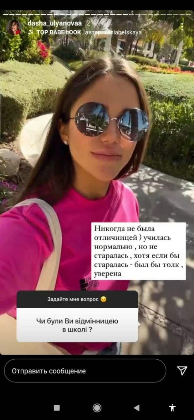 Сейчас девушка активно занимается своим блогом в Инстаграм и намерена продолжать заниматься гимнастикой и далее. Также недавно в социальной сети девушка решила ответить на самые частые и популярные вопросы фанатов: По словам Даши, реагировать на неадекватные сообщения она привыкла довольно быстро и если бы кто-то увидел, что иногда ей пишут, то у кого-то точно был бы шок. Также девушка заявила, что особо примечательные комментарии иногда отправляет на «доску позора». Ульянова подчеркнула также, что в прошлом во время учебы она никогда не была отличницей, но и не старалась это сделать, хотя если бы попыталась, то толк бы из нее был бы наверняка. Отвечая на распространённый вопрос о губах, Даша заявила, что ей идут не только пухлые формы, но и второй подбородок. Позже девушка показала, как выглядят ее губы после постоянных манипуляций и хотя она уже полгода с ними ничего не делала, они по-прежнему весьма большие и не надо бояться это делать в принципе, главное - хороший специалист. Отметим, ранее девушка решила показать, как она веселится после того, как снова улетела отдыхать в теплые края – в ОАЭ. Новыми снимками звезда поделилась в разделе Стори на своей странице в Инстаграм. Так, Даша показала яркое фото из отдыха на пляже и засветила при этом стройные ножки. И не забыла при этом девушка похвалиться также местной кухней, которая ей так нравится. Однако самым неожиданным снимком для поклонников стал шуточный кадр Ульяновой с тайным возлюбленным. Даша решила поделиться фото, на котором она позирует и позади нее проходит мужчина в традиционном балахоне. В подписи Ульянова отметила, что «Многие просили показать жениха». Напомним, Даша из "Холостяка" пустилась во все тяжкие после измены Макса Михайлюка: "Вторая Волочкова" А еще Politeka писала, что в жизни пары из "Холостяка" случилось непредвиденное, Даша ошарашила деталями: "Макс признался, что..." Также Politeka сообщала, победительница "Холостяка" Даша Ульянова без белья ошеломила дерзкой выходкой: "Будущая звезда"