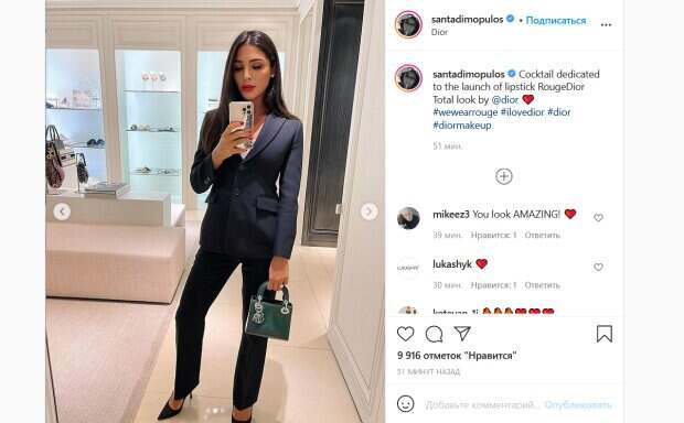 Для этого мероприятия знаменитость выбрала стильный брючный костюм, который придал ее внешности некую изюминку. Единственным ярким акцентом в образе Димопулос стала красная помада. На коротком видео певица показала, как красит губы перед зеркалом. Волосы красотка оставила распущенными, тем самым придав своему виду женственности и лоска. Поклонники артистки пришли в восторг от ее нового поста. «Нереально красивые волосы!!», «Санта, на Вас не то что Диор, мешок надень - будет шикарно. Вы просто ослепительны в этом образе!», «Вау как вам идет, особенно красные губы», «Красиво сидит на Вас костюм и волосы блестят», «Какая же Вы красивая!!! И не только внешне!», «Класс, красивый строгий и женственный образ», «Какая крутая помада!!! Вы очень красивая», «Само совершенство», «Самая обаятельная и привлекательная», «Дорого-шикарно-вкусно», «Шикарен костюм и модель», «Вы очень стильная и красивая!», - пишут люди. Напомним, что Санта Димопулос пошла по стопам Киркорова, ошеломив дорогущими развлечениями. Как сообщала Politeka, Юлия Санина разразилась обвинениями в адрес Димопулос. Также Politeka писала, что Санта Димопулос рассекретила неизвестные фото закулисья.