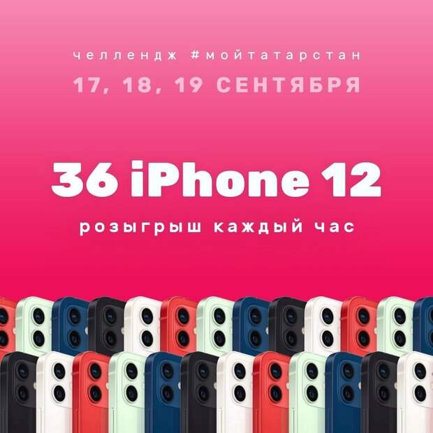 В рамках проекта «Народный Татарстан» пройдет челлендж #МойТатарстан — он продлится с 17-19 сентября. Каждый житель республики сможет выиграть один из 36 iPhone 12. Для участия нужно: Сделать селфи на своем избирательном участке. Выложить фотографии во ВКонтакте или Instagram с хэштегом #МойТатарстан. Розыгрыши будут проходить каждый час с 08:00 до 20:00 в прямом эфире сообщества проекта ВКонтакте «Народный Татарстан».