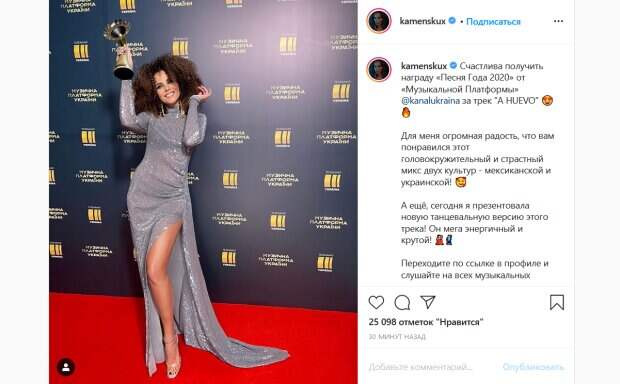Настя Каменских в платье со смелым вырезом похвасталась своим новым достижением Популярная украинская певица стала обладательницей премии «Песня Года 2020» от «Музыкальной Платформы» за трек «A HUEVO», о чем поспешила рассказать на своей странице в Инстаграм. Об этом сообщает Politeka.net. Настя поблагодарила за награду и призналась, что очень рада ее получить.