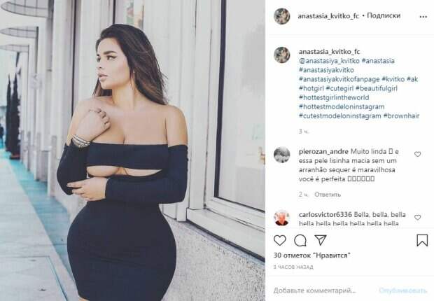Сейчас Квитко находится на пике своей популярности. Поклонники размещают разные фото Анастасии в своих группах. Так, в одной из фан-страничек появился снимок Насти в черном платье с вырезом в районе груди. В таком виде пышногрудая знаменитость прошлась по улице. Бюст без белья едва ли не выпрыгивал из столь откровенного наряда. В глаза бросается нереалистично тонкая талия и пышные бедра. Большая грудь, стройная талия и немаленькие бедра - создали фигуру "песочные часы", которая очень нравится мужчинам. Пост в фан-группе, набирающей популярность, за три часа собрал десятки лайков и несколько комментариев. Пользователи сети написали модели много приятных слов. "Покорительница сердец", - написал один из поклонников. Ранее мы писали, что Анастасия Квитко позировала в купальнике, который казался порванным. Модель надела светлый купальник, из которого едва ли не выпрыгивал бюст. Для пущей откровенности Анастасия намазалась лосьоном, и ее загоревшие груди стали эффектно сиять на солнце. Напомним, продемонстрировала пышные достоинства и едва прикрыла самое главное салатовым бикини. Модель частенько делится подобными фотографиями и, бывает, нарывается на критику. Однако положительных отзывов о фигуре модели значительно больше. Напомним, что Анастасия Квитко не удержала сочные формы, натянув слишком маленькое бикини: "Это просто мед!" А еще Politeka писала, что Анастасия Квитко показала свою «ким» в откровенном купальнике: «Вау, светится». Также Politeka сообщала, что Анастасия Квитко подразнила пышными "пончиками" в одной сеточке и кружевах: топ "вкусных" образов