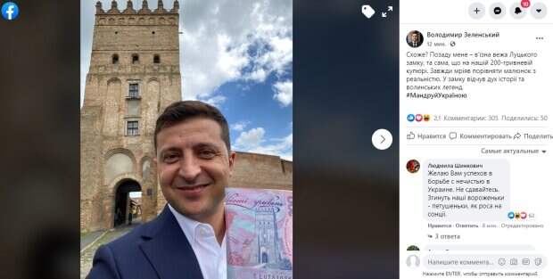 На снимке Владимир Зеленский улыбается и держит в руках деньги, о которых написал в посте: "Похоже? Позади меня - въездная башня Луцкого замка, та самая, что на нашей 200-гривневой купюре. Всегда мечтал сравнить рисунок с реальностью. В замке почувствовал дух истории и волынских легенд". Пользователи социальных сетей прокомментировали пост Владимира Зеленского. Многие отметили, что у президента есть более важные дела, чем прогулки по историческим местам: "Нормальный ход. Главное не превратить эту купюру в бесполезную бумажку, тем самым унизить украинский народ и его труд. Все ваши предшественники успешно это делали"; "Владимир Александрович! Но как Вы все успеваете, вчера в Черновцах, сегодня уже в Луцке?"; "Какое счастье, что мечты Презедента сбываются"; "Это ооочень, ну прям оооочень важное занятие для президента!"; "И мы ваши избиратели мечтаем о достойной жизни и хоть куда-то поехать. Не поверите"; "Интересно, а работать когда он уже будет? Все отдыхает, по достопримечательностям катается". Напомним, украинка разочаровалась в "ненастоящем" Зеленском: "Вы нас просто добиваете". Как сообщала Politeka, Зеленский нарушил закон, появилось признание президента: «сумма в 50 прожиточных минимумов». Также Politeka писала, что эксперт рассказал, при каких условиях "скинут" Зеленского: "угроза начнется тогда, когда...".