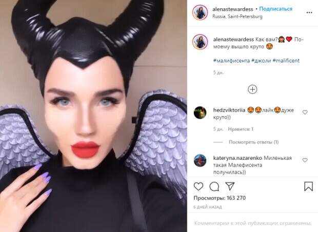 "Как вам?🙈❤️ По-моему вышло круто 😍", - спросила стюардесса мнение пользователей. Комментирующие пришли в полный восторг, засыпав девушку комплиментами: и ее красоте, и таланту. "Миленькая такая Малефисента получилась))" "Эмм, я всегда думал что в том фильме снималась Джоли, а выходит, что это была Alenastewardess💁🏼♂️" "Это просто бомба какая схожесть🔥" "Один в один😍😍" "Не отличить!!!😻😻" "Очень круто! Но, я хочу больше стервозности во взгляде, а ты кукольная😁" "Ну просто как две капли😍😍 нереально красивая 👍💋" "Русская Малефисента 100%😍🙈" "Отправила Анджелине-то??🔥😍" "Лучше оригинала даже 🔥" Ранее мы сообщали, в сети обсуждают смертельно худую Джоли, вышедшую на прогулку с сыном. Актриса была одета в черное бесформенное платье на бретельках, которое оголило ее руки. Кроме этого, она надела необычную защитную маску, на которой были изображены стрелки. Стоит отметить, что особое внимание поклонников привлекли руки звезды, которые были похожи на руки старой изможденной женщины. Они выглядели как руки ведьмы из фильма, в котором снималась звезда. Правда, Малефисента отдыхает по сравнению с нынешним видом актрисы. Ноги Джоли тоже выглядели очень худыми. Напомним, что Анджелина Джоли напугала траурным видом на прогулке с дочкой, сеть кипит: «Как бабка». Как сообщала Politeka, болезненно худую Джоли в бесформенной одежде засняли на прогулке с сыном: «Красоты уже нет». Также Politeka писала, что наглая Джоли без угрызения совести рассказала, как увела Питта: "Подогревала интерес...".