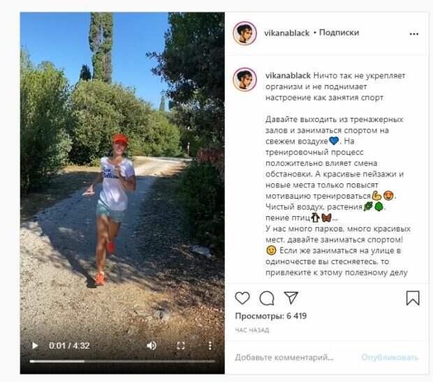 Девушка выполнила несколько упражнений перед камерой. Об этом пишет Politeka.net со ссылкой на страничку знаменитости. "Ничто так не укрепляет организм и не поднимает настроение как занятия спорт Давайте выходить из тренажерных залов и заниматься спортом на свежем воздухе. На тренировочный процесс положительно влияет смена обстановки. А красивые пейзажи и новые места только повысят мотивацию тренироваться. Чистый воздух, растения, пение птиц", - написала Виктория. Фанаты посмотрели видео почти 7 тысяч раз и написали комментарии: "За кадром комментатор от Бога", "Весёлая,милая,чёрная кошечка", "У меня мама странная какая-то. Говорит постоянно что я жирная и мне надо худеть . Сажусь на диету , все прекрасно получается - она все время меня подкармливает ... ! Чуть ли не мордой в тарелку", "Голос за кадром придает позитива", "Хмм, не так давно видела ваши фото ((в какой-то то там группе)) ну и все ж восхищались вашей фигурой. И одна дамочка (подруга или знакомая) доказывала всем, что у вас точеная фигура от природы, и вы никогда не занимались спортом". Напомним, фигуристая солистка "НеАнгелов" насладилась жарким отдыхом в тесном топике А еще Politeka сообщала, что обольстительная Вика из "НеАнгелов" в крохотных шортиках изящно управилась с клюшкой Также Politeka писала, что Вика из "НеАнгелов" выставила напоказ «бомбочки» в жарком монокини, фото