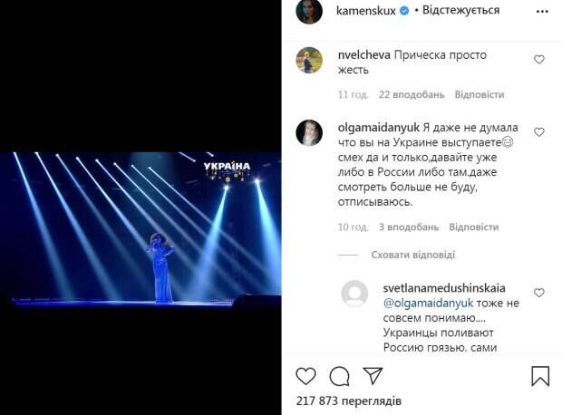 Отметим, не смогла пройти мимо такого поста даже Оля Полякова. «Очень круто», - написала она. Поклонники Каменских также в восторге, правда не всем понравилось, что песня на русском языке. «Ой, Настюша это отпад», «Вот такая Настя это мощно», «Большая молодец! Шикарная, очень нежная песня, до мурашек», «Какая же Настя чувственная и красивая! Песня кайф», «Я даже не думала что вы на Украине выступаете
